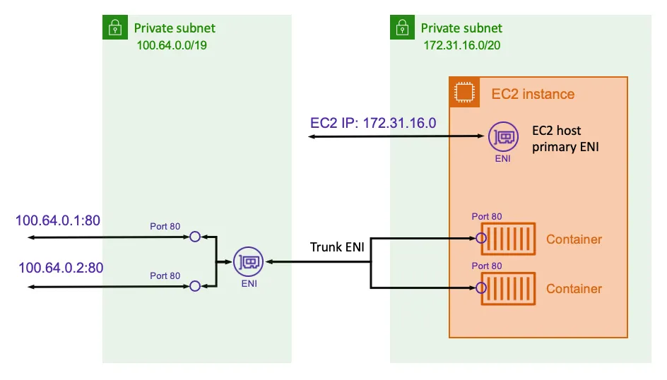 ENI Trunking은 ECS가 EC2 인스턴스당 시작할 수 있는 컨테이너 작업의 수를 크게 늘립니다. ENI 트렁킹 모드에서는 EC2 호스트당 2개의 ENI만 사용됩니다. 하나의 ENI는 EC2 호스트에서 사용되며, 다른 하나의 트렁크 ENI는 호스트의 모든 컨테이너가 공유합니다.