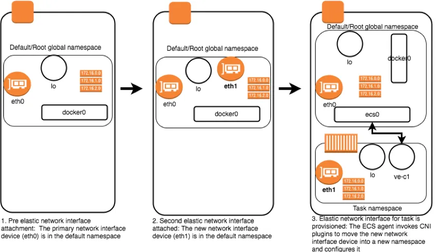 ECS가 인스턴스에 탄력적 네트워크 인터페이스를 연결하고 에이전트에 메시지를 전송하여 작업의 컨테이너에 대한 탄력적 네트워크 인터페이스를 프로비저닝하면, ENI가 호스트의 Global Default 네트워크 네임스페이스에 표시됩니다. ECS 에이전트는 CNI plug-in 체인을 호출하여 컨테이너의 네트워크 네임스페이스에서 ENI가 적절하게 구성되었는지 확인합니다.