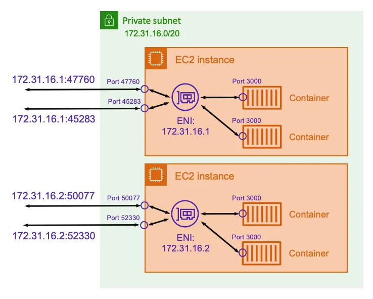 하나의 EC2 Instance에서 여러개의 동일한 Container Port 혹은 Task를 실행할 수 있지만, 서비스간 네트워크 제어가 쉽지 않다.