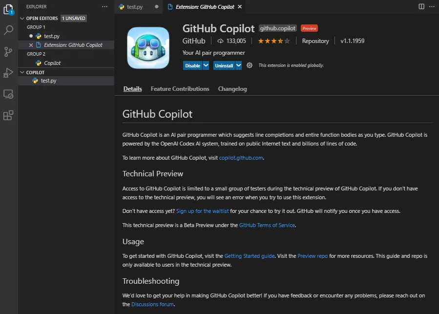 Install을 누르면 VSCode에서 Copilot을 설치할 수 있다.