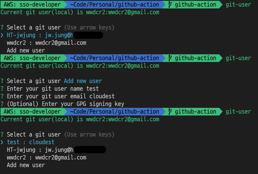 git-user 명령어로 사용자를 switch하거나 새로운 사용자를 등록할 수 있다.