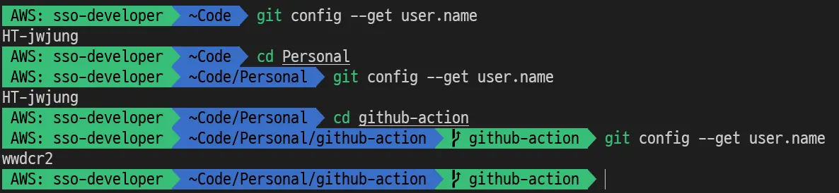 의도한대로 ~Code/Personal 하위 경로는 모두 개인 계정이 사용되고, 이외의 경로에서는 회사 계정이 사용되는 것을 확인할 수 있다.