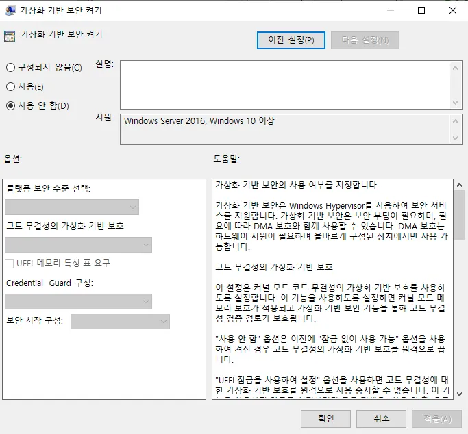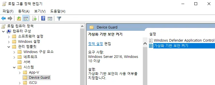 컴퓨터 구성 → 관리 템플릿 → 시스템 → Device Guard → 가상화 기반 보안 켜기 더블클릭