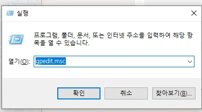 Win + R 을 눌러 실행창 열고 gpedit.msc 입력