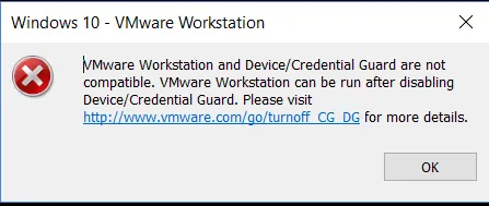 VMware Workstation and Device/Credential Guard are not compatible. VMware Workstation can be run after disabling Device/Credential Guard. Please visit http://www.vmware.com/go/turnoff CG DG for more details