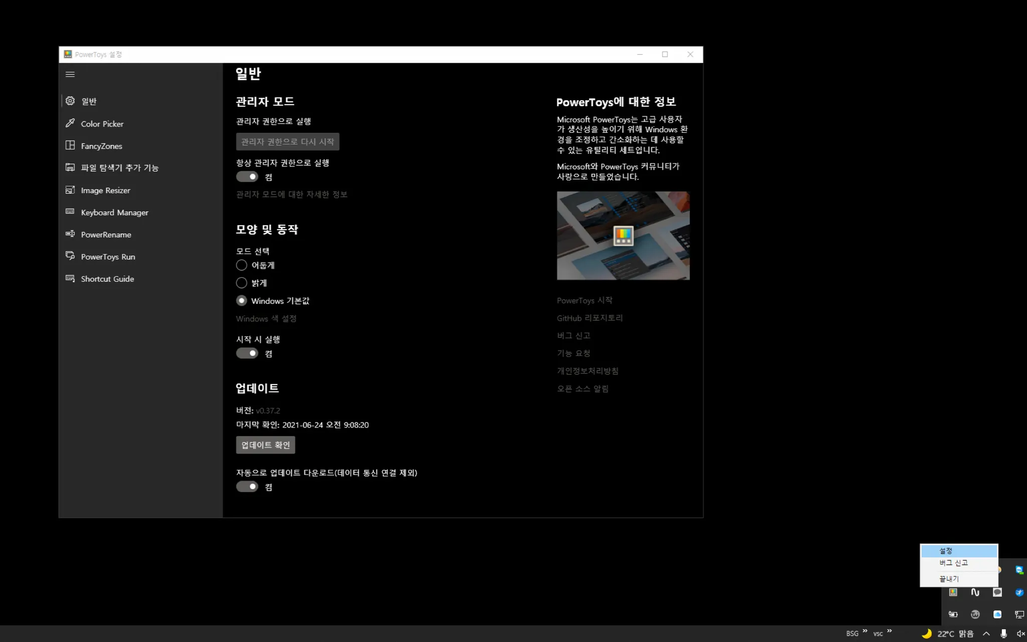 PowerToys를 설치하고 실행한 후 좌측 하단 아이콘 트레이에서 PowerToys의 설정을 열면 다음과 같은 화면이 나온다. Windows Setting이랑 비슷하다.