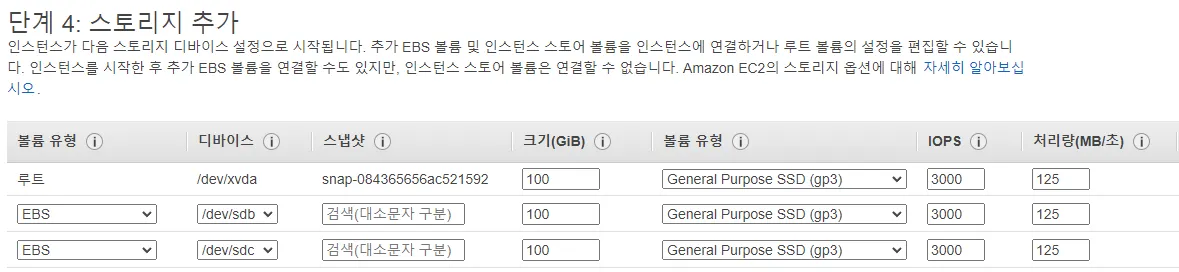 Amazon Linux2에 100GB EBS 2개를 추가해서 생성한다.