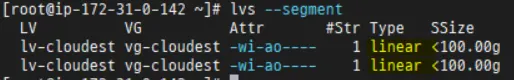 논리 볼륨 정보를 조회하는 lvs --segment 명령어로 LVM 정보를 확인해보면 Type이 linear로 조회된다.