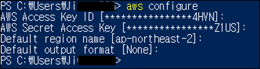 S3 Upload는 AWS CLI를 사용하여 진행했다. AWS configure 명령어를 통해 AWS CLI 설치를 설정했으며 . 해당 명령어를 위해 네 가지 정보를 다음과 같이 필요하다. (Administrator 권한을 가진 IAM을 생성해서 테스트했다.)