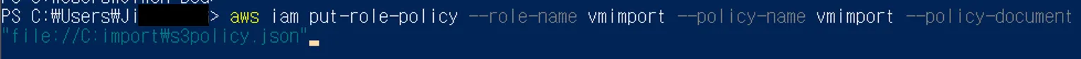 aws iam put-role-policy --role-name vmimport --policy-name vmimport --policy-document "file://C:import\s3policy.json"