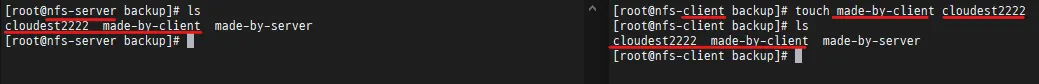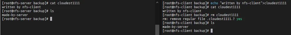 NFS Client가 cloudest1111 파일을 수정하고 삭제한것을 NFS Server에서도 확인할 수 있다.
