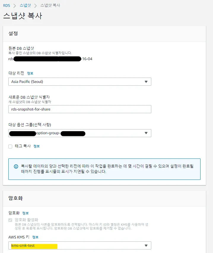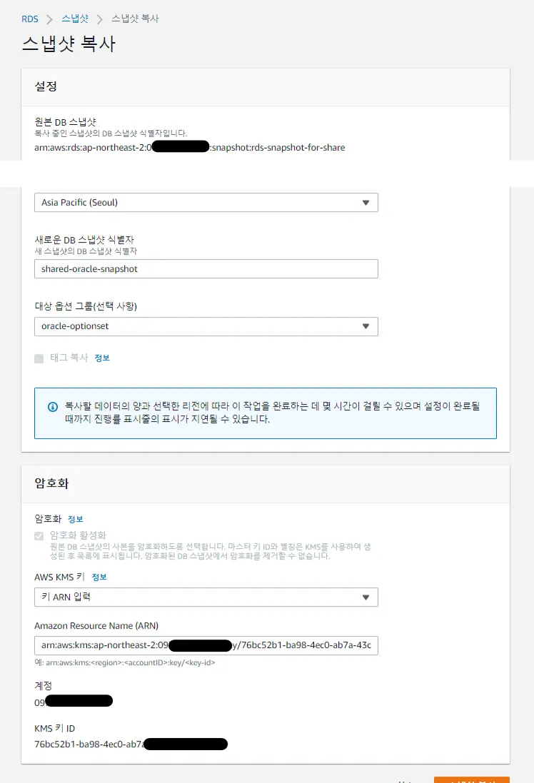 다음 사진과 같이 설정하고 스냅샷을 복사한다. (KMS 변경 필수)