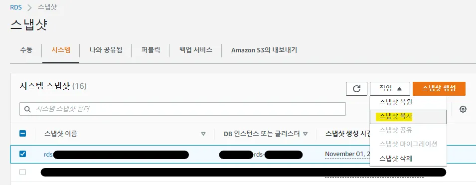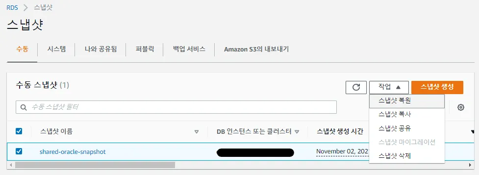 공유받은 스냅샷으로는 바로 복원할 수 없고, 스냅샷 복사를 거쳐야한다.