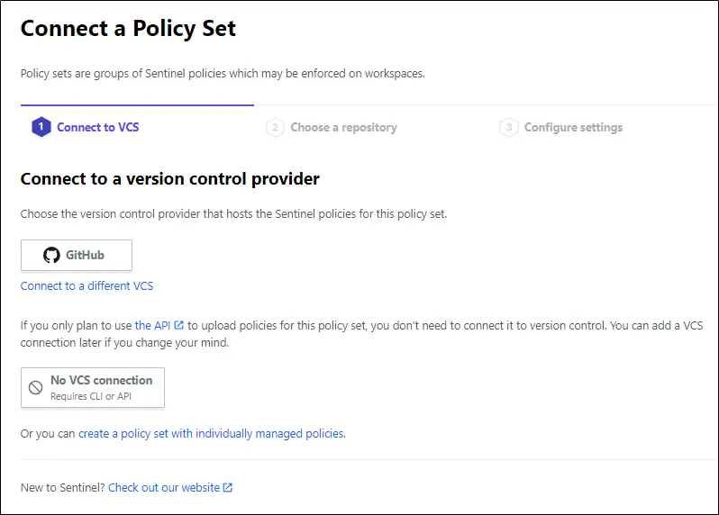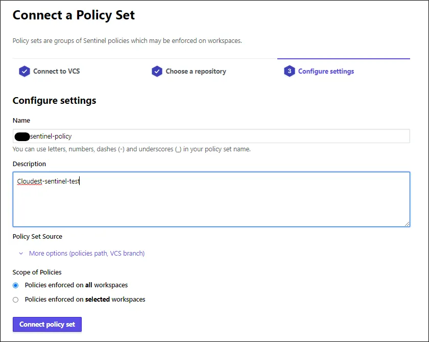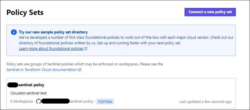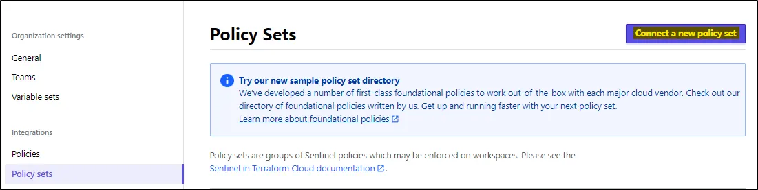 Terraform Cloud의 Settings에서 Policy sets를 생성한다.