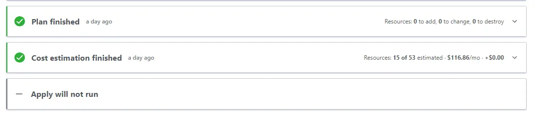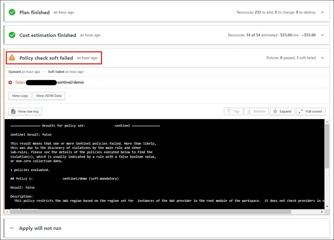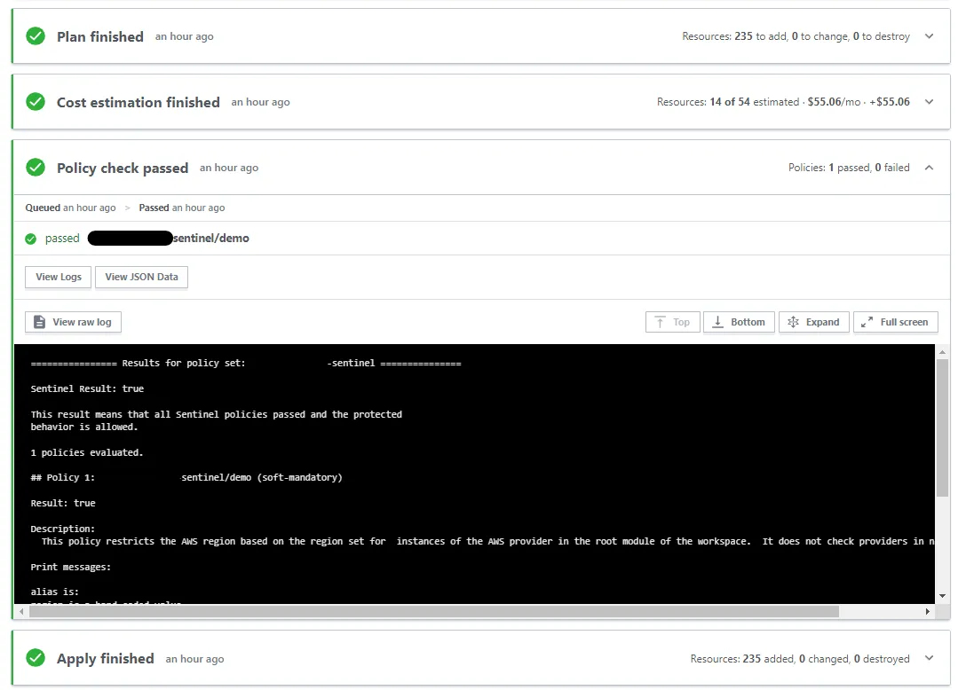 Sentinel을 적용하면 Plan과 Apply 사이에 단계가 하나 더 생성되며, Sentinel을 활성화하고 간단한 Rule을 적용하여 테스트 해봤다.
