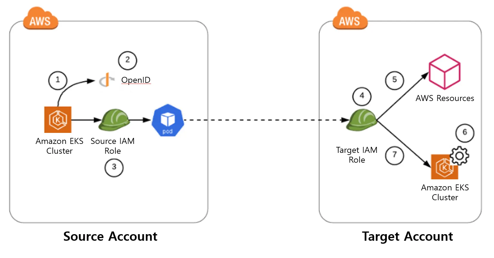 Pod에게 IAM Role (Source-Role)과 연동된 Service Account를 부여하고, Source-Role이 Target Account의 IAM Role (Target-Role)을 사용할 수 있도록 설정합니다.